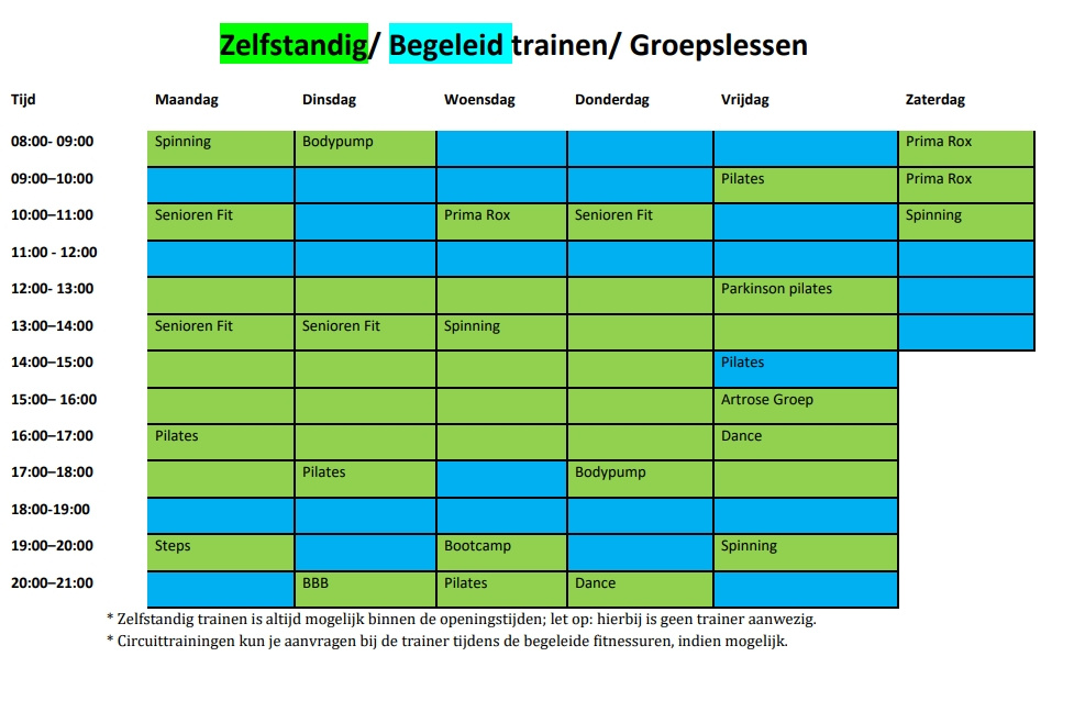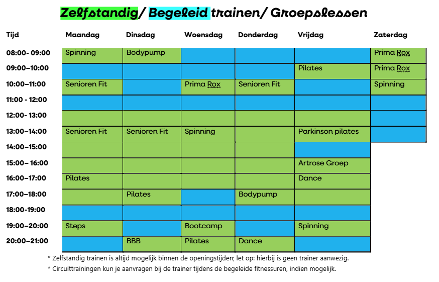 * Circuittrainingen kun je aanvragen bij de trainer tijdens de begeleide fitnessuren, indien mogelijk.